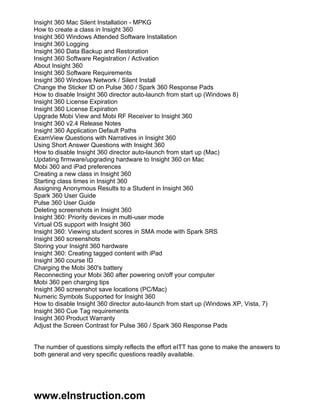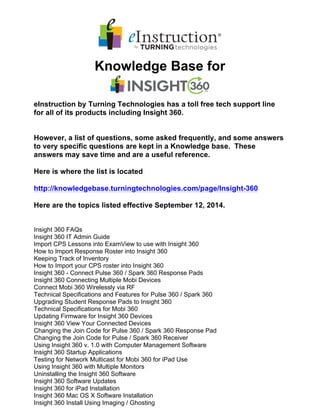 The document provides information about the toll-free tech support line for Turning Technologies' Insight 360 products, along with a comprehensive knowledge base of frequently asked questions and detailed guides. It includes topics such as device connectivity, software installation, and troubleshooting. For further inquiries or demonstrations, contact information for a consultant is also provided.