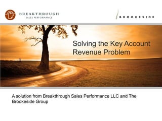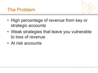 This document discusses the problem of relying too heavily on key accounts for revenue without proper strategies. It outlines how companies are at risk of losing key accounts and revenue when they do not have: 1) reliable ways to measure relationship strength, 2) cross-selling strategies, or 3) retention plans. The solution presented is an analytics tool called INSIGHTTM that identifies at-risk accounts, openness to cross-selling, and strategies for growth. It provides benchmarks, tailored reports, and drives action plans to maximize key account revenue and relationships.