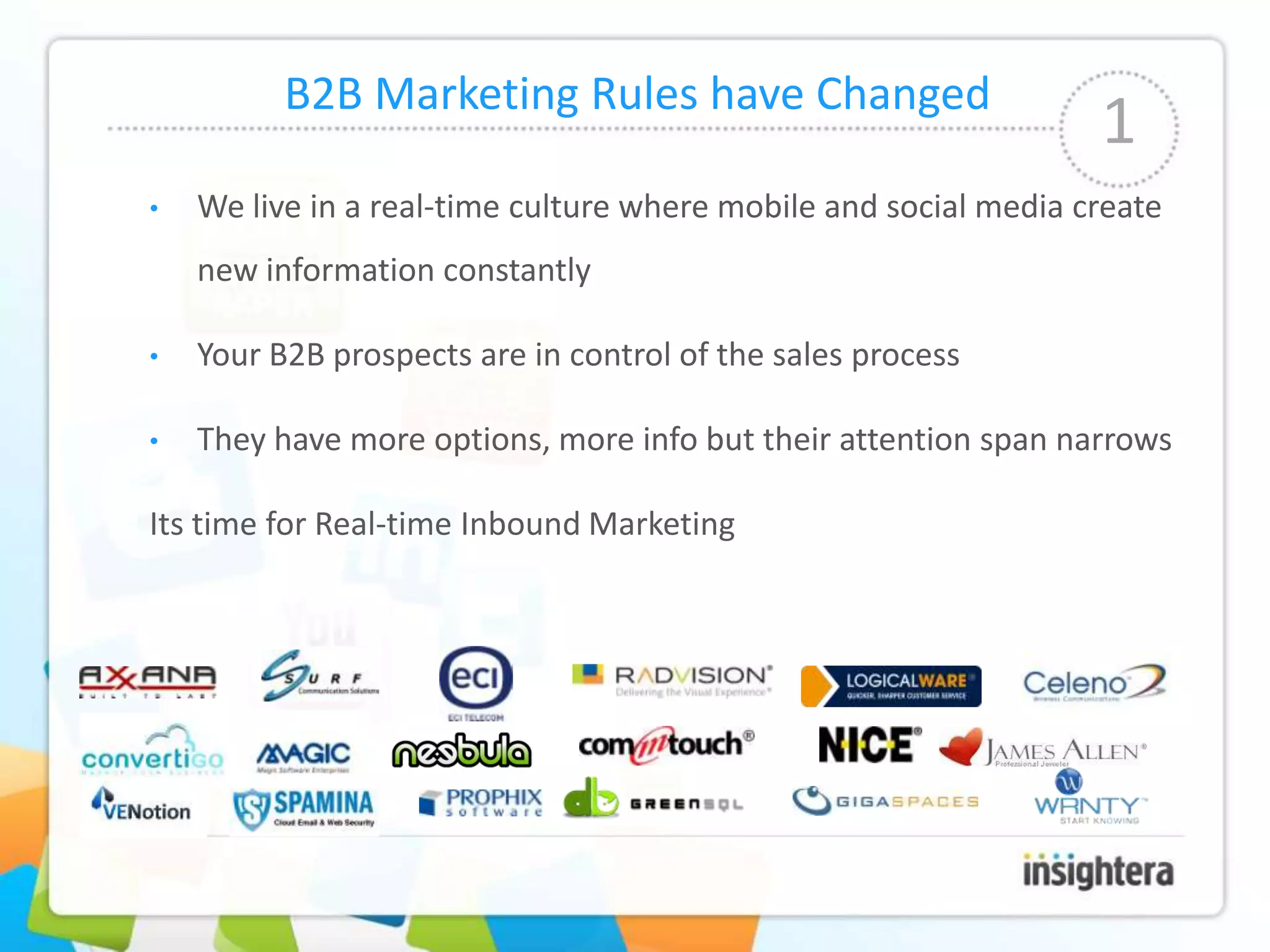 The document discusses how real-time inbound marketing can help businesses engage prospects in today's mobile and social media environment. It recommends capturing prospects' intent through adaptive content and auto-engaging them with the right message at the right time. This approach aims to improve conversion rates and generate more qualified leads by extending the reach of existing marketing assets through real-time engagement of top-funnel anonymous prospects.