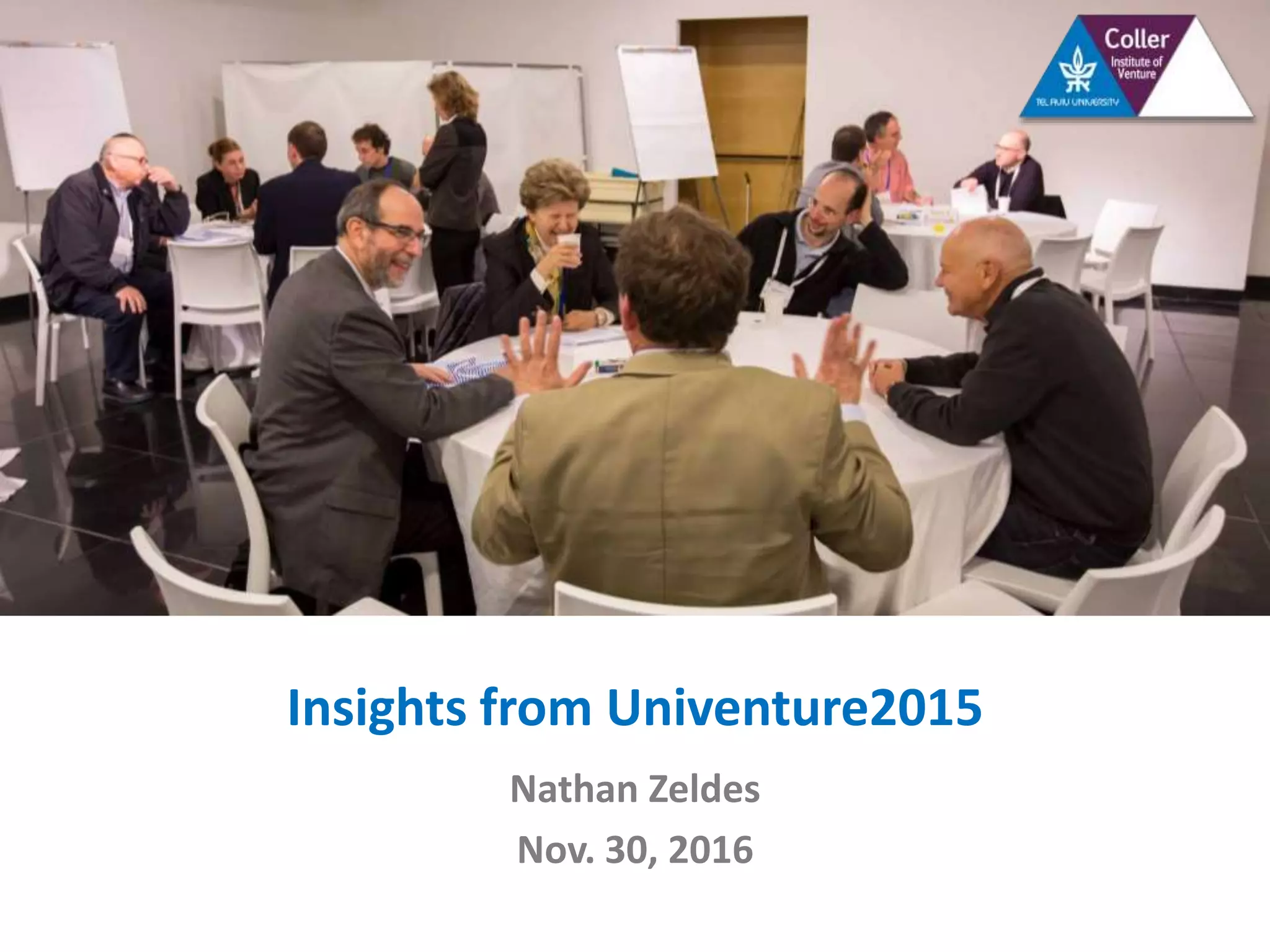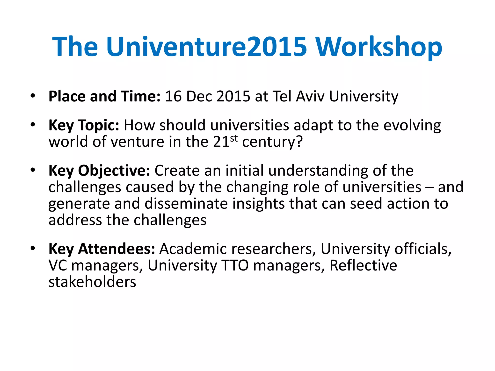 The document summarizes insights from the Univenture2015 workshop about how universities should adapt to changes in venture opportunities. Key themes discussed included the need for: interdisciplinary research that bridges fields; changes to teaching curriculum and methods to include more entrepreneurship education and hands-on learning; new incentive structures that reward collaboration over individual achievements; mentoring from industry; better connections between business and academia; streamlining technology transfer offices; and balancing basic and applied research while protecting academic freedom. The workshop brought together academics, university officials, venture capitalists, and other stakeholders.