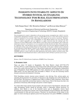 The document discusses the acute electricity shortage in Bangladesh, particularly highlighting the need for electrification on Saint Martin Island, where 45% of the population lacks access to electricity. It presents a hybrid system combining solar, wind, and diesel energy as an efficient solution for electrification, using HOMER software for load calculation and optimization. The proposed system aims not only to provide electricity to the local population and tourism but also to reduce carbon emissions and promote sustainable energy generation.