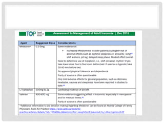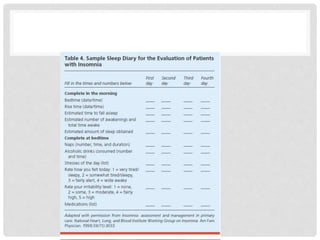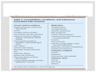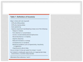 Insomnia is defined as difficulty falling asleep, staying asleep, or early awakening despite opportunities for sleep, associated with impaired daytime functioning for at least 3 nights per week for over a month. It can be acute (under 3 months) or chronic. Assessment involves evaluating sleep history, screening for sleep apnea and mental health issues. Treatment goals are improving sleep quality, decreasing distress, and improving daytime function. Non-pharmacological therapies like CBT, sleep hygiene, and sleep restriction are recommended initially. Hypnotics may be used short-term but have risks and should be avoided for chronic insomnia if possible. CBT-I is the cornerstone treatment and can be combined with short-term medication