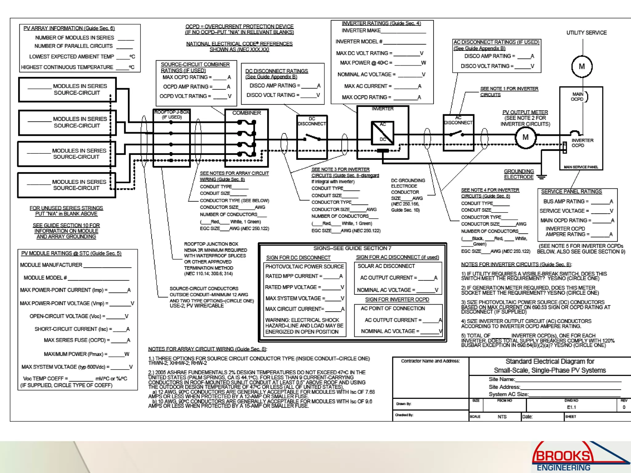 This document provides guidelines for inspecting photovoltaic (PV) systems to ensure code compliance, highlighting the need for uniformity in permit processes and safety standards. It outlines relevant codes, best practices, and the expedited permitting process for small-scale projects, designed to facilitate safe installations while raising professionalism among contractors. Additionally, it discusses the basic components and electrical design considerations critical for compliance with the National Electrical Code.