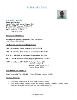 This document provides a curriculum vitae for P. Karuppasamy, an inspection engineer with over 10 years of experience in quality assurance and quality control for various oil, gas, and industrial projects. It outlines his educational background in mechanical engineering, professional certifications, training courses completed, familiarity with relevant codes and standards, employment history with various companies in Saudi Arabia, and responsibilities in areas such as piping and welding inspection, equipment inspection, tank inspection, and coating inspection.