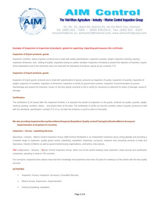 The Viet-Nhan Agriculture - Industry - Marine Control Inspection Group offers a wide range of inspection, quality control, testing, and certification services for agriculture, industry, and marine sectors globally. They specialize in pre-shipment inspections, third-party inspections, and certification for compliance with quality specifications. With over 20 years of experience, they operate in nearly 100 countries, providing services aimed at ensuring goods meet required standards for import and export.