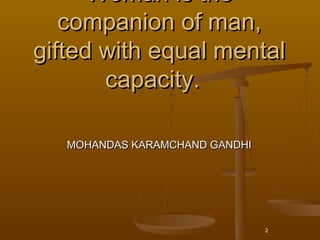 This document contains 10 inspirational quotes from notable figures about women and women's rights. The quotes discuss women as equal partners to men, the importance of empowering women to create change in society, and the significance of giving women a voice and the courage to stand up for their dignity and equality.