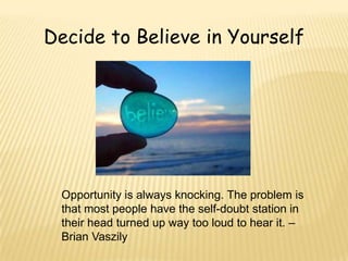 The document provides tips for achieving happiness, including believing in yourself, living up to your potential, making memories, having a good sense of humor, being true to yourself, having fun, finding contentment, and doing something that matters as illustrated by quotes from various authors.