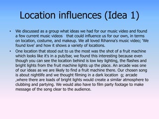 The group discussed influences for their music video's location, costumes, and footage from other artists' music videos. For the location, they were inspired by shots from Rihanna's "We Found Love" video and think an arcade with bright lights would fit their song about nightlife. Regarding costumes, they saw Jessie J's all-black outfit in "Bang Bang" and think similar stylish outfits would work for their video. High heels were also noted as making legs look longer and outfits look more dressed up. For footage, they were influenced by the getting ready scene from "Bang Bang" and think including similar shots would show their group preparing to go out. Their second location idea was inspired by Keh