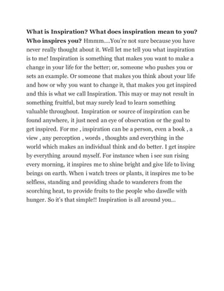 The document explores the concept of inspiration as a powerful motivator that drives individuals to make positive changes in their lives. It illustrates the importance of recognizing sources of inspiration in everyday life and emphasizes the significance of turning inspiration into meaningful action through personal responsibility. The narrative includes a parable about a peasant who gains a reward for confronting an obstacle, reinforcing the idea that overcoming challenges can lead to greater rewards.