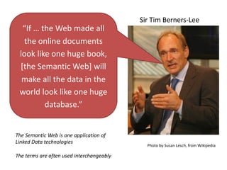 This document introduces linked data and the semantic web. It defines linked data as using URIs to identify things on the web and describe them using standard formats like RDF to link related things. This allows data on the web to be treated like a large database. The semantic web builds on linked data principles to publish structured data on the web that can be processed by machines, helping make information more discoverable and science more reproducible. Challenges include agreeing on definitions, performance of query languages, and the effort required to publish high-quality linked data.