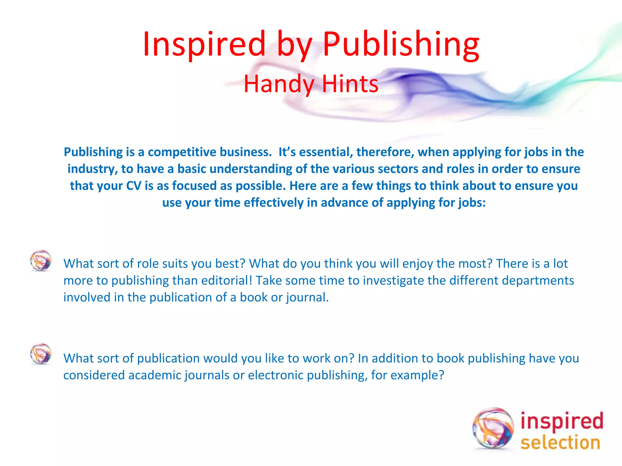 This document provides guidance on entering the publishing industry and outlines several key roles within publishing. It discusses editorial, design, production, sales, marketing, rights, and contracts roles. For each role, it identifies important skills and qualifications. The document encourages readers to research different types of publishers and gain relevant work experience to be competitive for entry-level publishing jobs.