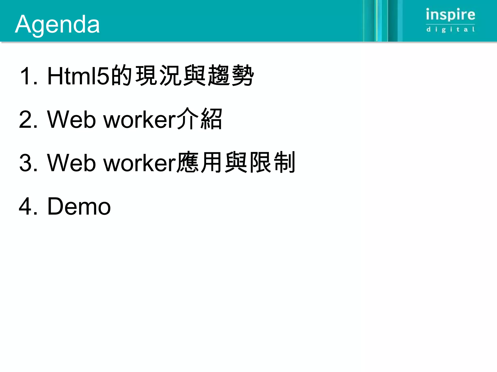 文档讨论了2013年HTML5的发展现状与趋势,强调了Web Worker的介绍及其应用限制。HTML5在移动应用和桌面应用方面的崛起、响应式设计的流行以及云计算的出现是重要趋势。Web Worker提供多线程支持,改善前台性能,但存在对DOM和主线程对象的访问限制。