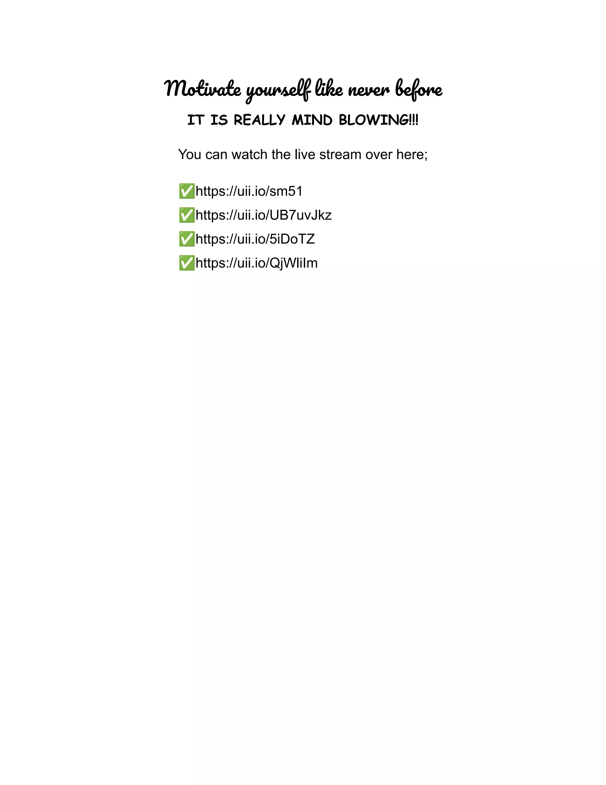 This document provides links to live streams that can help motivate yourself like never before. It shares 4 different live stream links with unique codes that may be helpful for self-motivation. The document suggests watching one of the live streams found at the listed URLs.