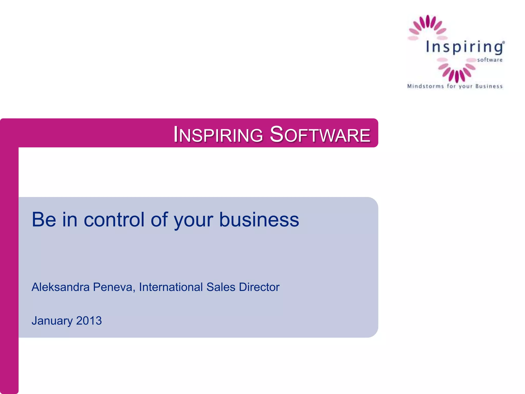 This document provides an overview of Inspiring Software, a company that offers web-based business software. It describes key features such as an intuitive interface, scalability, and integration capabilities. It also outlines the company's methodology, modules, professional services including consultancy and support, and solutions for energy management, maintenance management, and more. Case studies show how the software has helped customers reduce costs, optimize operations, and gain control over their energy consumption and assets.