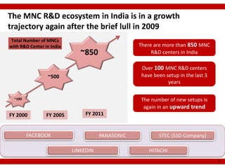 The number of MNC R&D centers in India has grown to over 850, with over 100 added in the last 3 years. Bangalore remains the top location, though New Delhi is growing fast. Most new centers focus on software and telecom and are established by smaller MNCs. Competition for talent with startups is increasing as billion dollar startups emerge from India. While India's R&D ecosystem has matured, few major global innovations have emerged, facing challenges like talent disengagement, limited domestic market size, and competition from other locations. Social innovation programs show potential to solve large societal problems through holistic solutions.