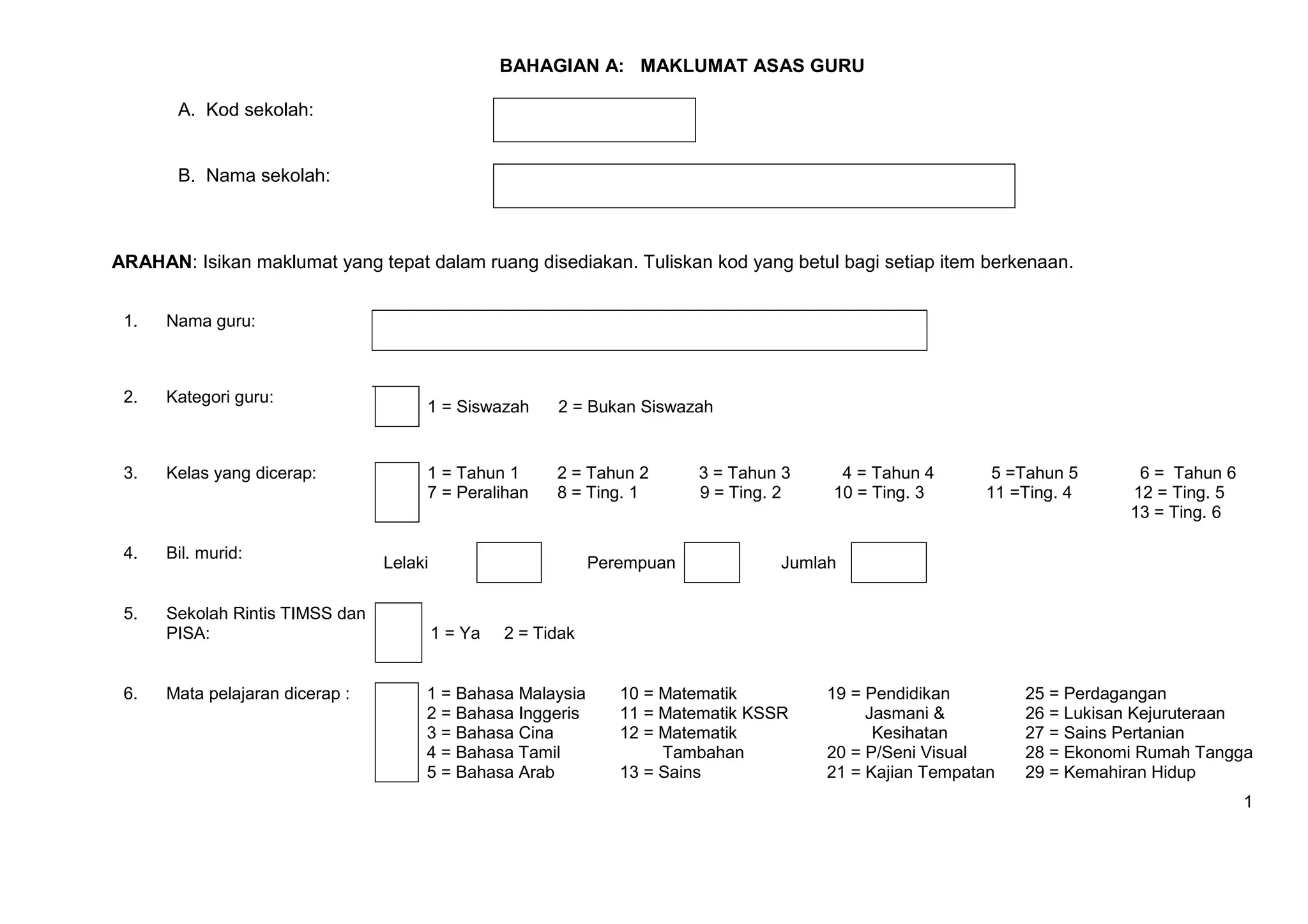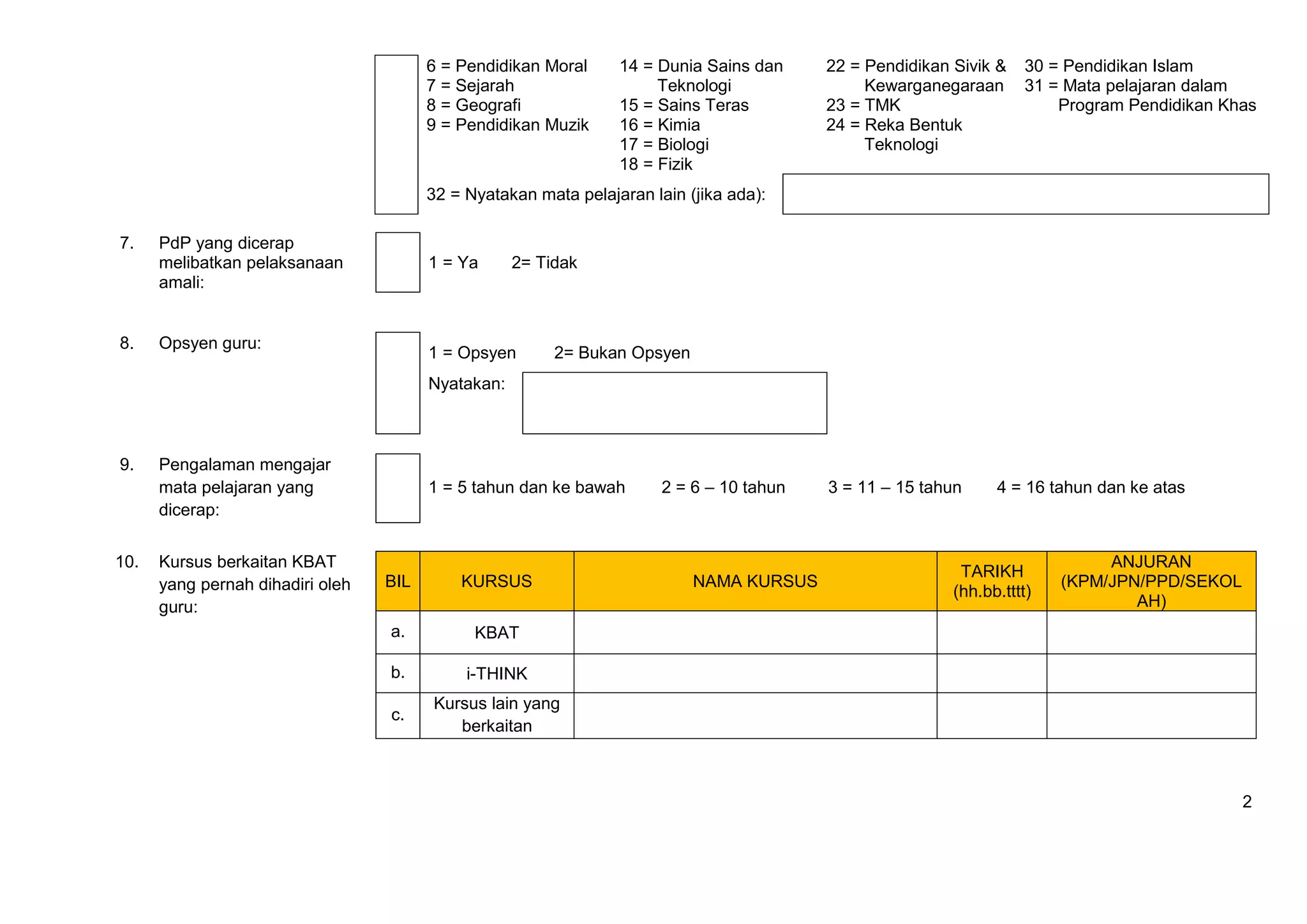 Dokumen tersebut berisi format untuk mengisi maklumat dasar guru dan penilaian terhadap kriteria kritis pembelajaran dan pengajaran (PdP) berdasarkan pengamatan kelas. Terdapat 10 kriteria kritis PdP yang dinilai berdasarkan skor 1-4 beserta panduan bukti dan justifikasi skor.
