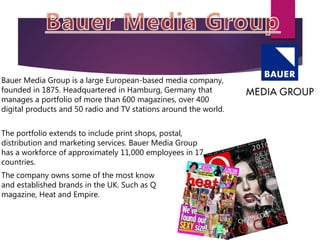 Bauer Media Group is a large European media company founded in 1875 with over 600 magazines, 400 digital products, and 50 radio and TV stations worldwide. Headquartered in Hamburg, Germany, Bauer Media Group employs around 11,000 people across 17 countries.