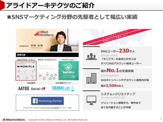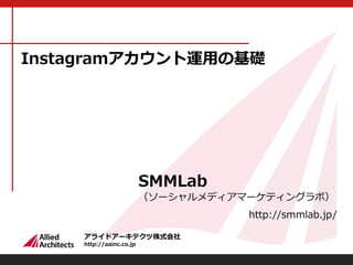 Architects, Inc. All Rights Reserved. 1 アライドアーキテクツ株式会社 http://aainc.co.jp Instagramアカウント運用の基礎 SMMLab (ソーシャルメディアマーケティングラボ) http://smmlab.jp/