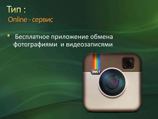 Документ описывает историю и функциональные возможности онлайн-сервиса обмена фотографиями и видеозаписями Instagram, созданного Кевином Систромом и Майком Кригером. В нем представлены ключевые даты, такие как запуск приложения в январе 2010 года и добавление хештегов в июне 2013 года, а также статистика пользователей и загруженных фото. Также упоминаются дополнительные функции и связанные приложения, такие как Instamap и 100 cameras in 1.