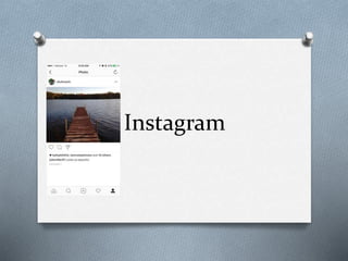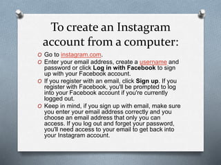 This document provides instructions for creating an Instagram account from a computer or mobile app, finding people to follow on Instagram, posting photos and videos to Instagram, adding captions, and sharing Instagram posts to Facebook. The key steps are to download the Instagram app, choose to sign up with an email/password or Facebook, take or upload photos/videos, add filters and captions, and share the posts. Instagram users can also find friends from their contacts or Facebook to follow.