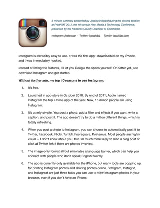Jessica Hibbard presented a summary at the FredNMT 2012 conference discussing the benefits of using Instagram, which has grown to 15 million users since its launch in 2010. She highlighted key reasons to use the app, including its simplicity, ability to connect with others visually, and potential marketing opportunities for brands. The presentation emphasized the positive community on Instagram and the potential for real-life interactions through events like instameets.
