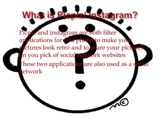 Instagram and Picplz are photo filter and sharing apps that allow users to apply retro-style filters to photos and share them on social networks. While similar, Instagram is only available on Apple devices and has more photo editing tools and a larger user base, while Picplz is Android-only but has been improving its features. The author recommends Instagram for new users due to its larger social network, but prefers Picplz as an experienced user since they have used it longer.