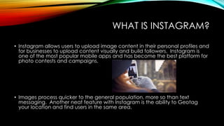 Instagram allows users to share photos and build followers. Images spread quicker than text on Instagram. Most users are aged 18-34, and post multiple times per day. The best times to post are 2am and 5pm. Businesses can use Instagram to tell visual stories that engage users and increase shares. Organizations can track engagement using tools like IconoSquare and promote hashtags. Instagram provides a low-cost way for businesses to creatively market through images and grow their following.