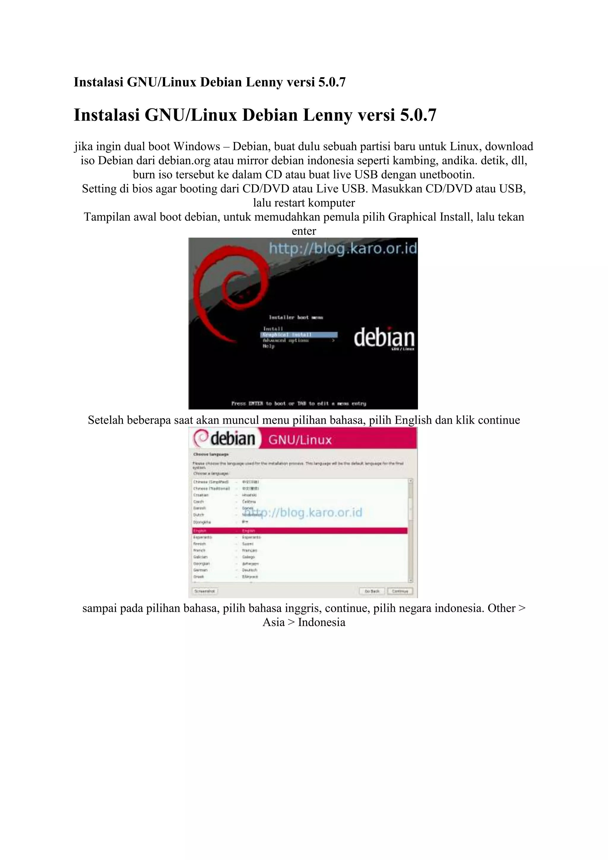 Instalasi Debian Lenny versi 5.0.7 melibatkan beberapa langkah seperti membuat partisi baru, memasang iso Debian, memilih bahasa Inggris pada saat instalasi, memilih partisi tunggal untuk memudahkan proses instalasi, dan mengatur konfigurasi jaringan serta pengguna untuk dapat login setelah instalasi selesai.