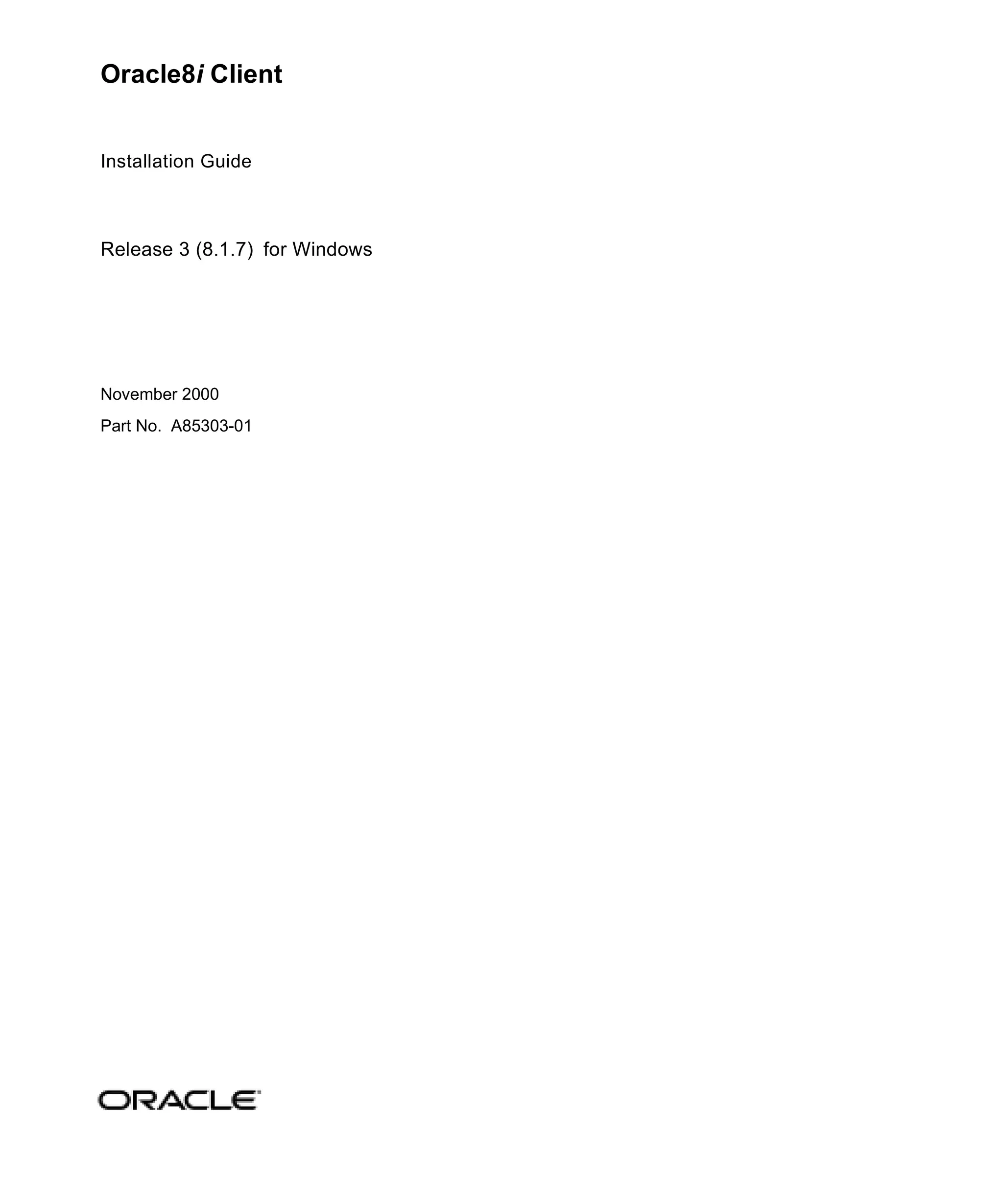 This document provides an installation guide for Oracle8i Client Release 3 (8.1.7) for Windows, describing the new features, components, system requirements, installation overview and process, configuration tasks, and how to deinstall Oracle components. It is intended for users installing or configuring Oracle8i Client on Windows NT, 2000, 95 or 98 systems and assumes familiarity with those operating systems and database concepts. The guide is organized to walk the user through introduction, preinstallation, installation, post-installation, and deinstallation steps.