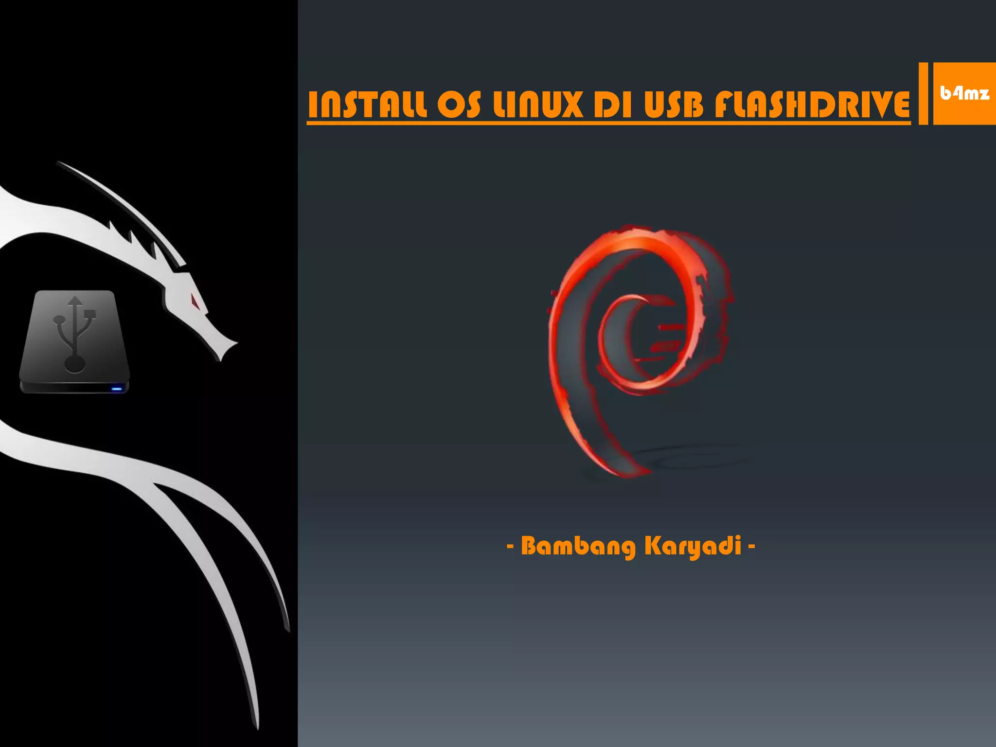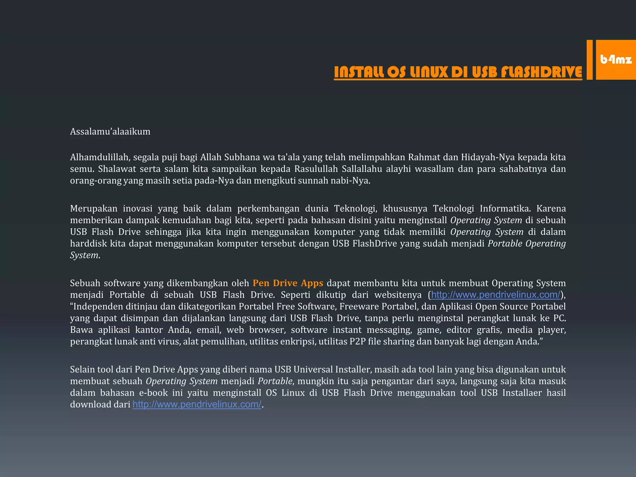 Dokumen ini memberikan panduan cara untuk menginstal sistem operasi Linux di USB flash drive menggunakan alat USB Universal Installer. Langkah-langkahnya meliputi persiapan perangkat keras dan perangkat lunak yang dibutuhkan, menjalankan USB Universal Installer untuk memilih ISO Linux dan memasangnya ke USB flash drive, serta mengatur BIOS untuk memulai dari USB flash drive agar sistem operasi Linux dapat dijalankan dari sana.