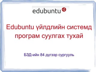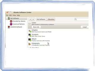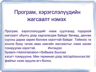 Програм нэмж суулгаххэд хэдэн арга байдаг: a . Applications->Ubuntu Software center... цэс рүү ороод View->All Software гэж тохируулж байгаад ангилалаас сонгон жагсаалтаас програмаа сонгоод шууд суулгах боломжтой. б. System->Administration->Synaptic package manager рүү ороод суулгах програмын нэрээр хайгаад суулгах. в. Тушаалын мөрнөөс (Applications->Accessories->Terminal) sudo apt-get install programiin_ner гэсэн тушаалаар суулгах. г. Шууд суулгаж болдог DEB installer буюу суулгагчийг веб сайтаас татаж аваад ажиллуулж суулгаж болдог. д. Соорс буюу програмын эх кодыг веб сайтаас нь татаж аваад өөрөө хөрвүүлж суулгаж болно. е. Wine гэдэг програмыг ашиглаад Windows-н зарим програмуудыг Линукс дээр суулгаж болдог . - 4.