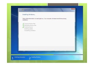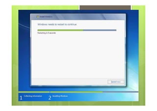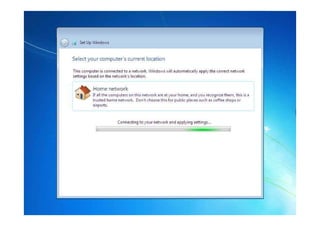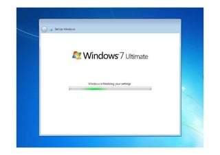 Dokumen ini membahas tentang pengertian, cara instalasi, dan manajemen file pada Windows 7. Windows 7 adalah rilis terbaru Microsoft Windows yang menggantikan Windows Vista dengan fokus pada pengembangan dasar Windows untuk kompatibilitas yang lebih baik. Dokumen ini juga menjelaskan langkah-langkah instalasi Windows 7 dan fitur-fitur baru seperti taskbar yang diperbarui, jump list, touch, dan pencarian Windows untuk manajemen file yang lebih mudah.