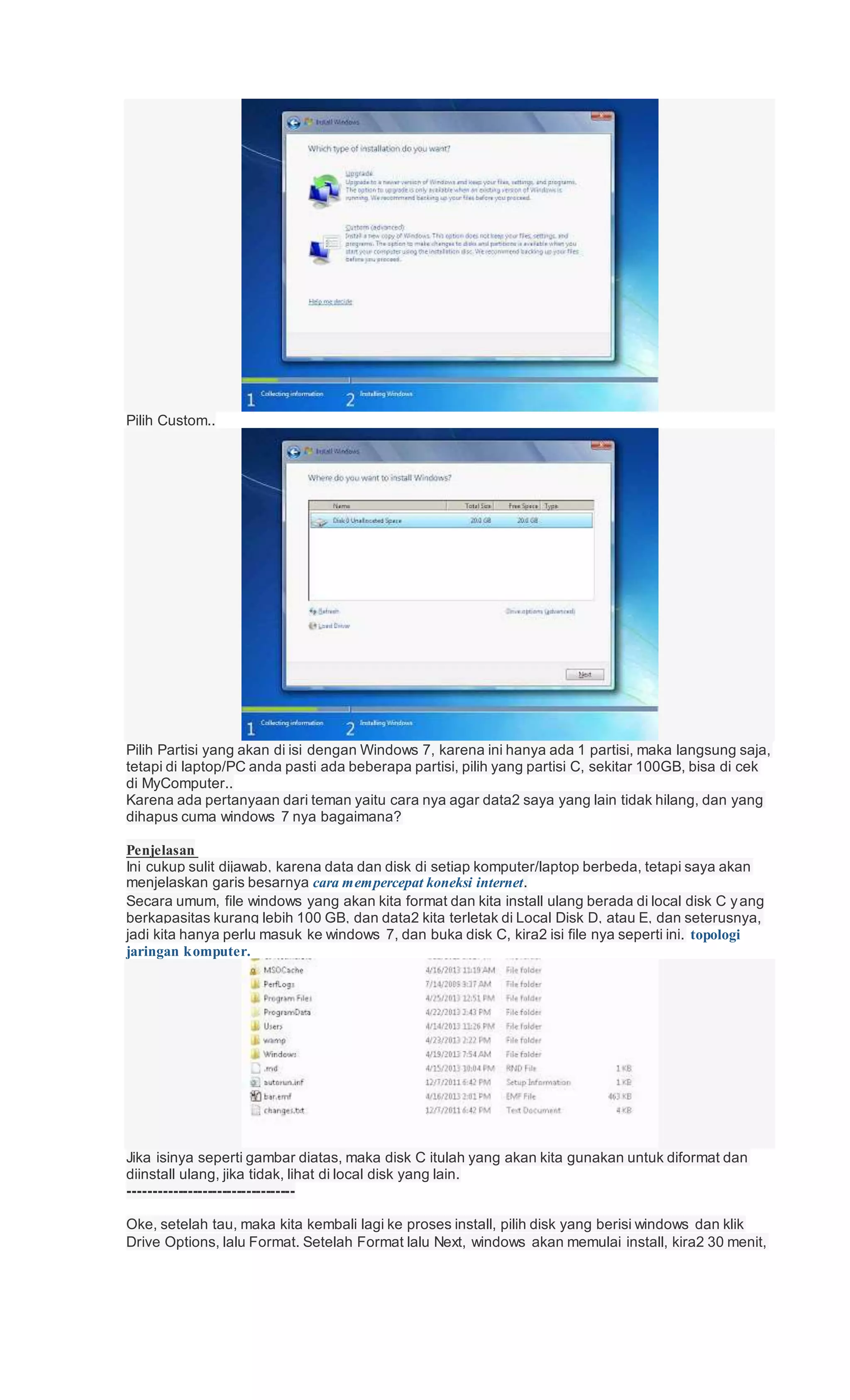 Untuk meringkas cara instal ulang Windows 7, perlu memiliki DVD Windows 7 yang masih baik, memasukkan DVD ke dalam drive, mengatur BIOS untuk memboot dari CDROM, lalu memilih format partisi C sebelum instalasi Windows 7 dimulai. Proses instalasi memakan waktu sekitar 30 menit.