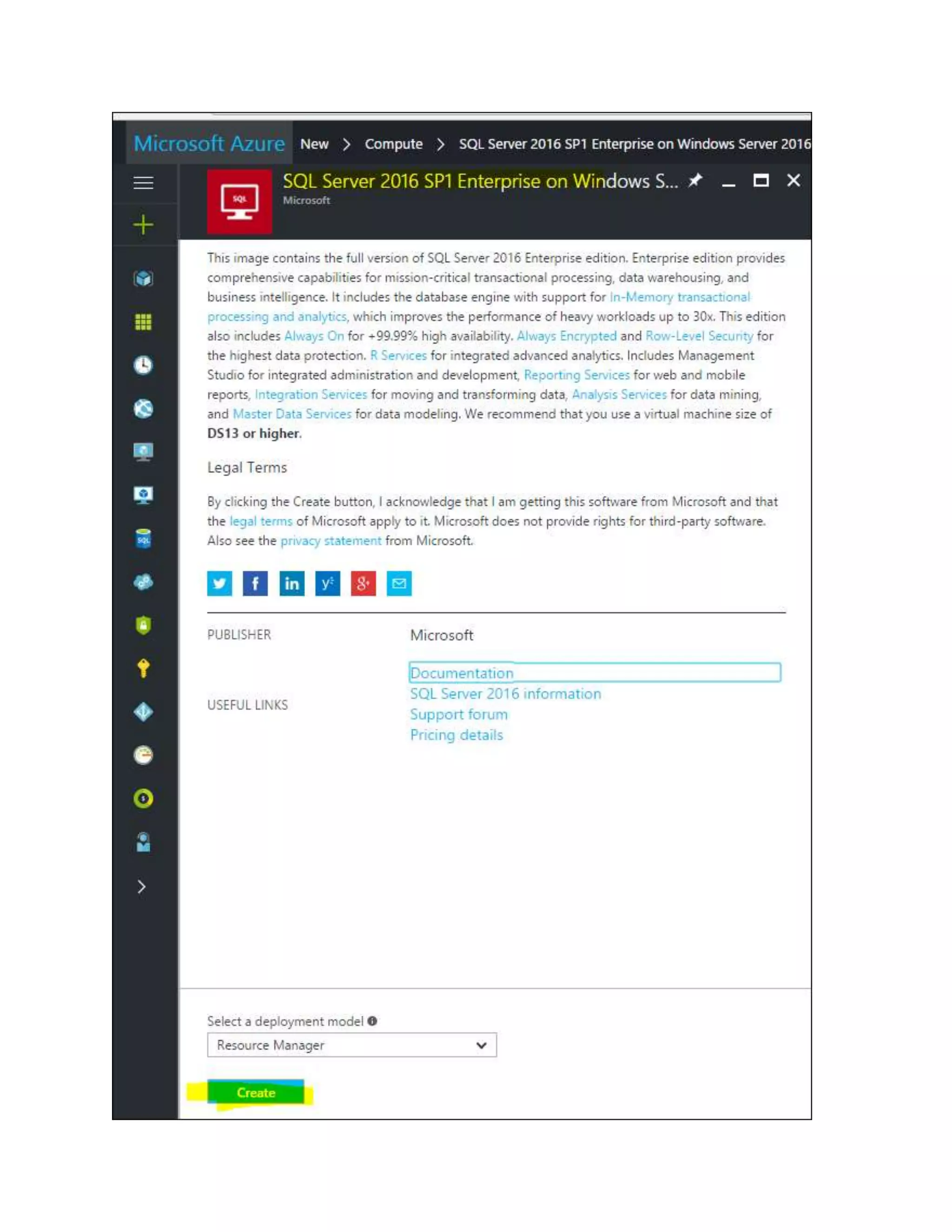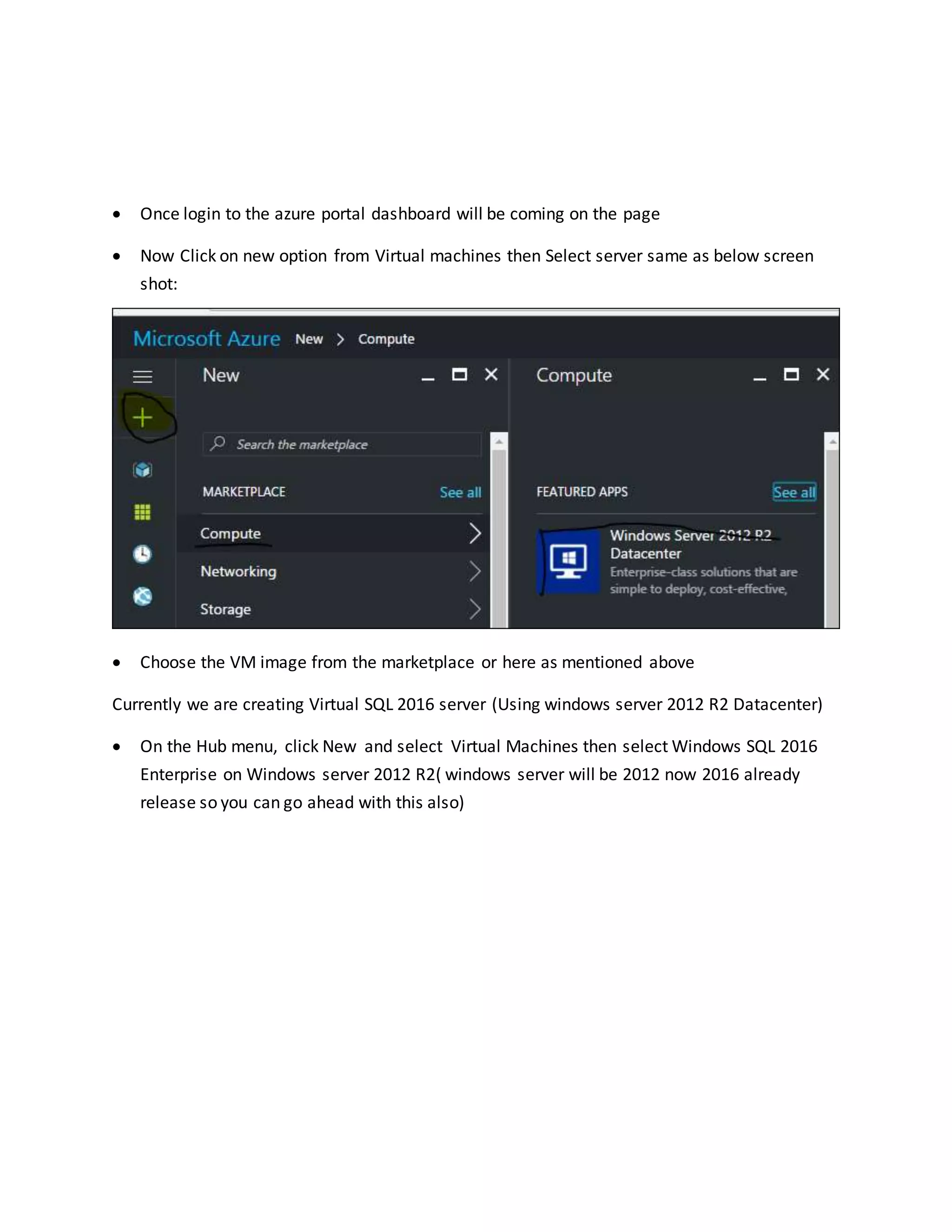 This document provides steps to install SQL Server 2016 Enterprise on an Azure virtual machine using a Windows Server 2012 R2 machine image. Key steps include creating an Azure subscription if needed, selecting the Windows SQL 2016 Enterprise image from the Azure marketplace, configuring basic settings for the virtual machine like name, user name, password, and location, reviewing additional settings like storage and networking, specifying SQL Server settings such as connectivity, ports, and backups, and reviewing and deploying the configuration. Once created, the deployment status can be monitored and once complete, the virtual machine can be connected to and logged into.