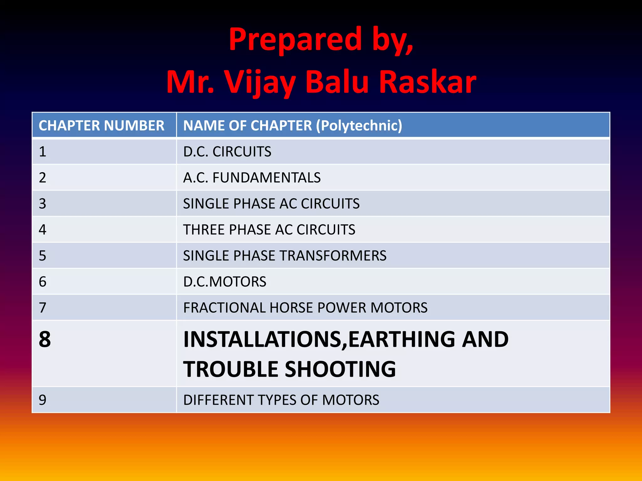 This document provides an overview of an electrical technology course, including: - A list of 9 chapter topics covering concepts like DC circuits, AC fundamentals, single and three phase AC circuits, transformers, DC motors, and more. - A section on electrical protection devices like fuses, MCBs, and MCCBs and their ratings and braking capacities. - Descriptions of different types of earthing methods including plate and pipe earthing, including materials used and installation details. - A brief definition of troubleshooting as the process of detecting faults in a circuit using instruments like megger, testers, and multimeters.