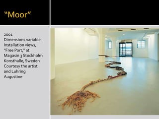The document summarizes information about four contemporary installation artists: Maya Lin, Janine Antoni, Judy Pfaff, and Martin Puryear. It provides biographical details and descriptions of key works for each artist. Maya Lin is known for the Vietnam Veterans Memorial in Washington D.C. Janine Antoni uses her own body and everyday materials in her performative pieces. Judy Pfaff creates immersive environments combining sculpture, painting and architecture. Martin Puryear's works blend minimalism with craft techniques and reference everyday objects.