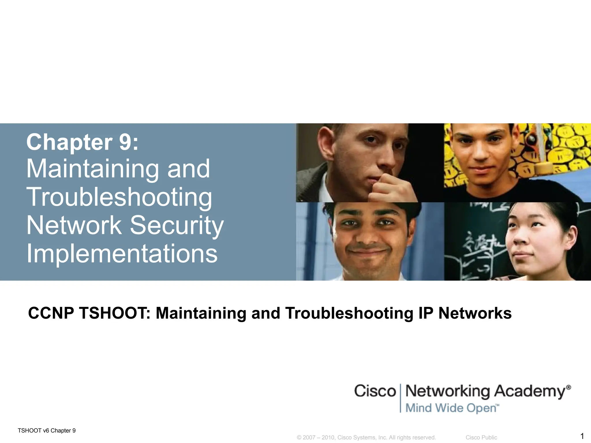 Chapter 9 focuses on maintaining and troubleshooting network security implementations, outlining key components such as management, control, and data planes. It emphasizes the importance of understanding security features that can impact troubleshooting processes, including AAA protocols for secure management access. The chapter also discusses common issues with TACACS+ and RADIUS authentication and how to troubleshoot them effectively.