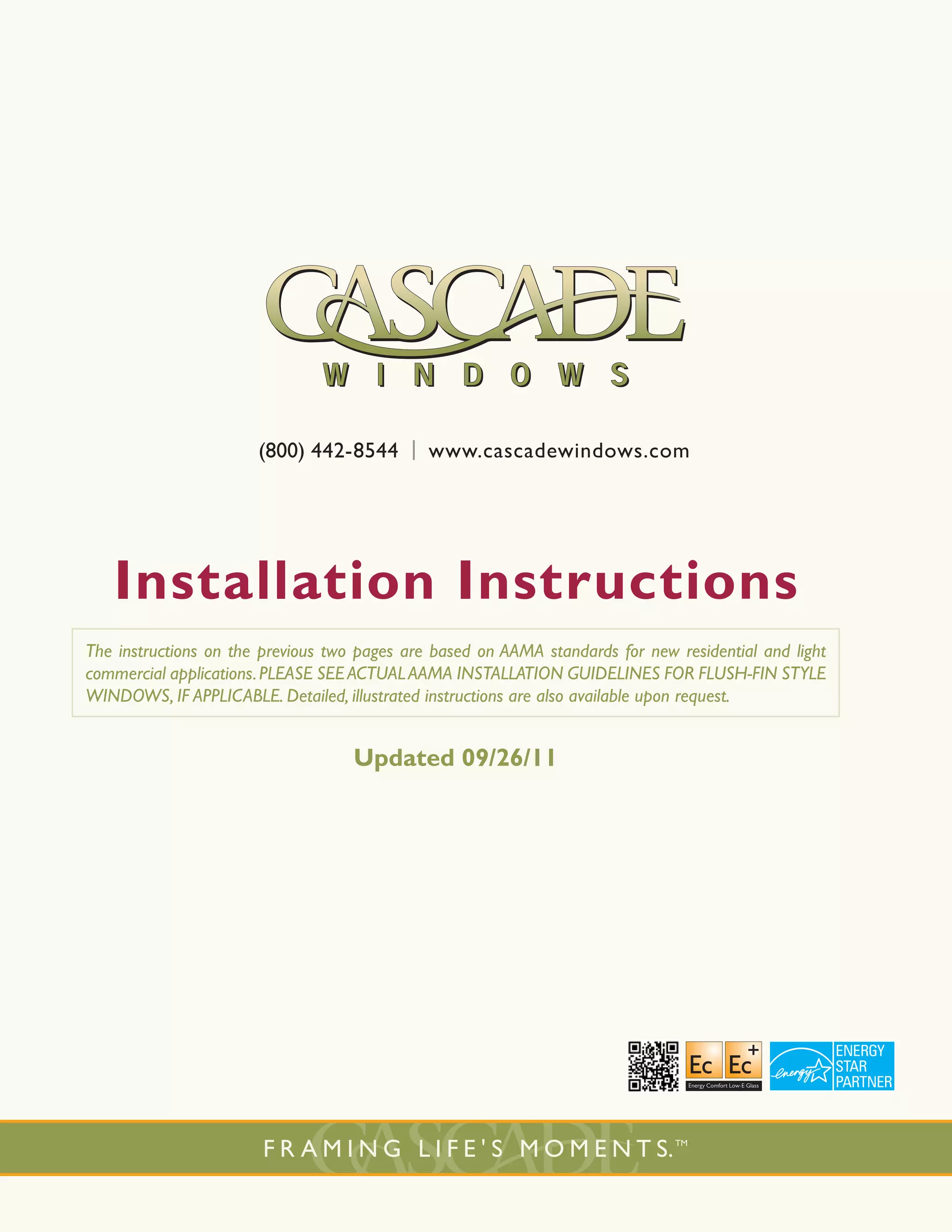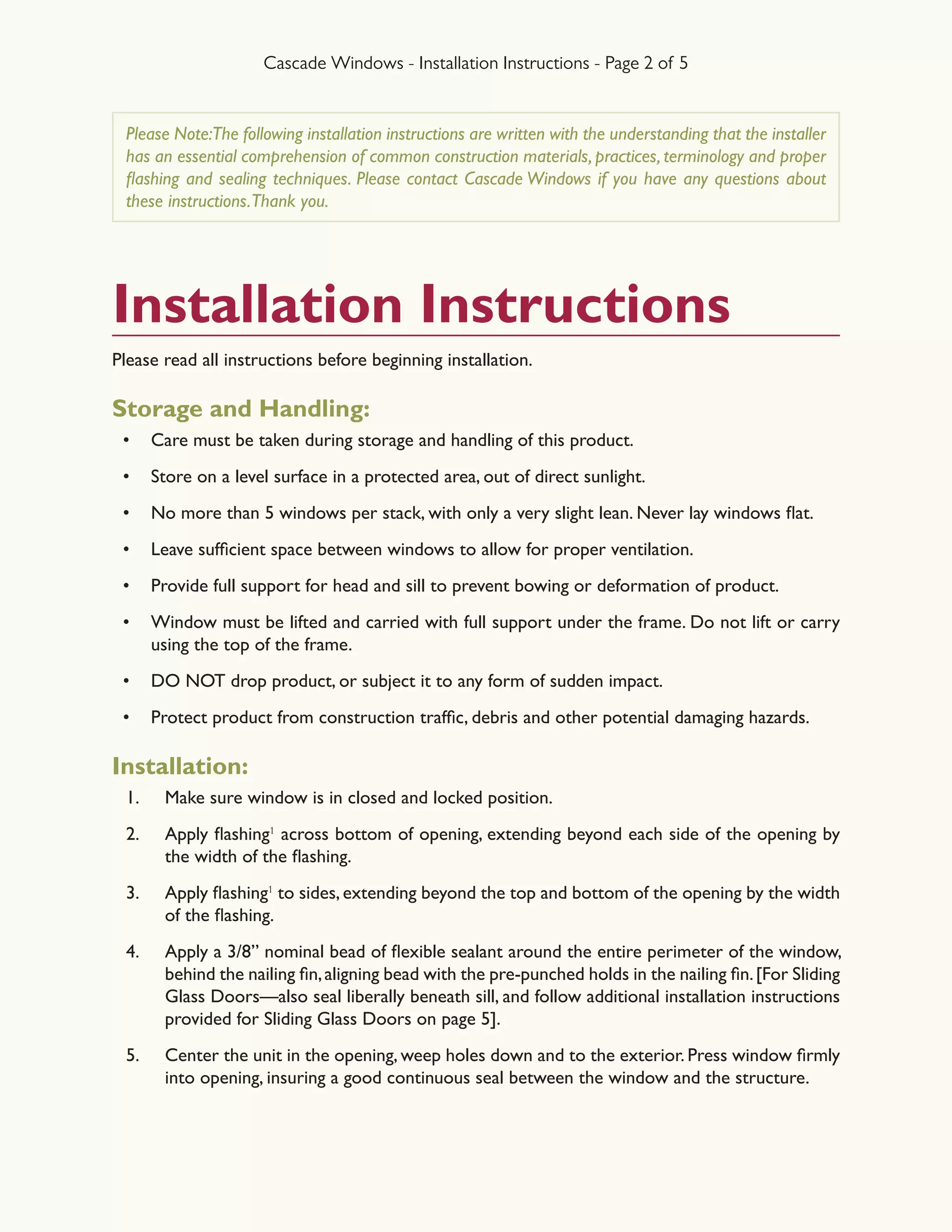 The document provides installation instructions for Cascade windows in 15 steps. It details how to properly store, handle, prepare the window opening, install flashing, apply sealant, install the window, secure it with fasteners, install insulation, ensure proper operation and clearance, and clean the window. Special instructions are provided for installing bay windows, flush-fin frames, accent windows, and sliding glass doors.
