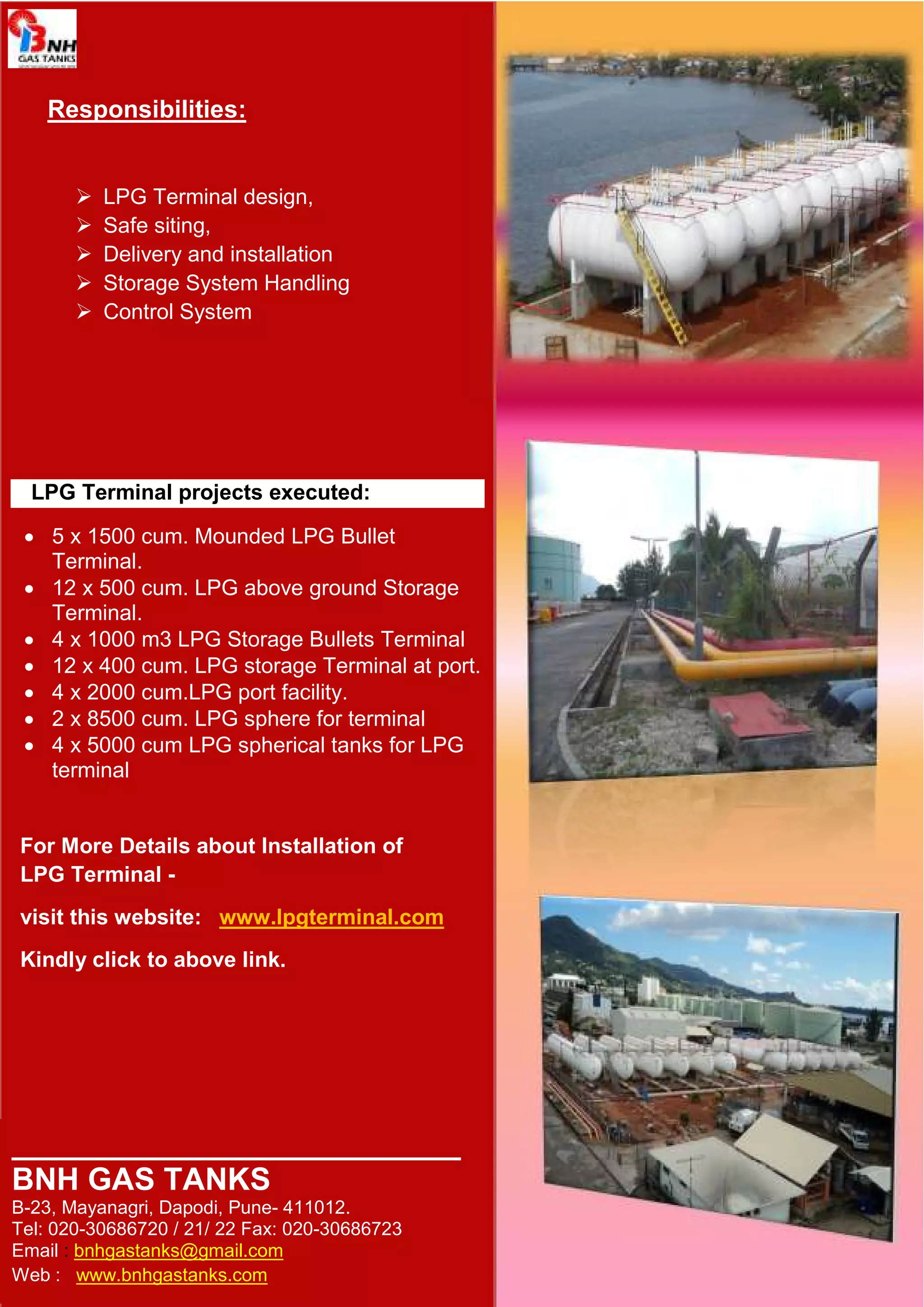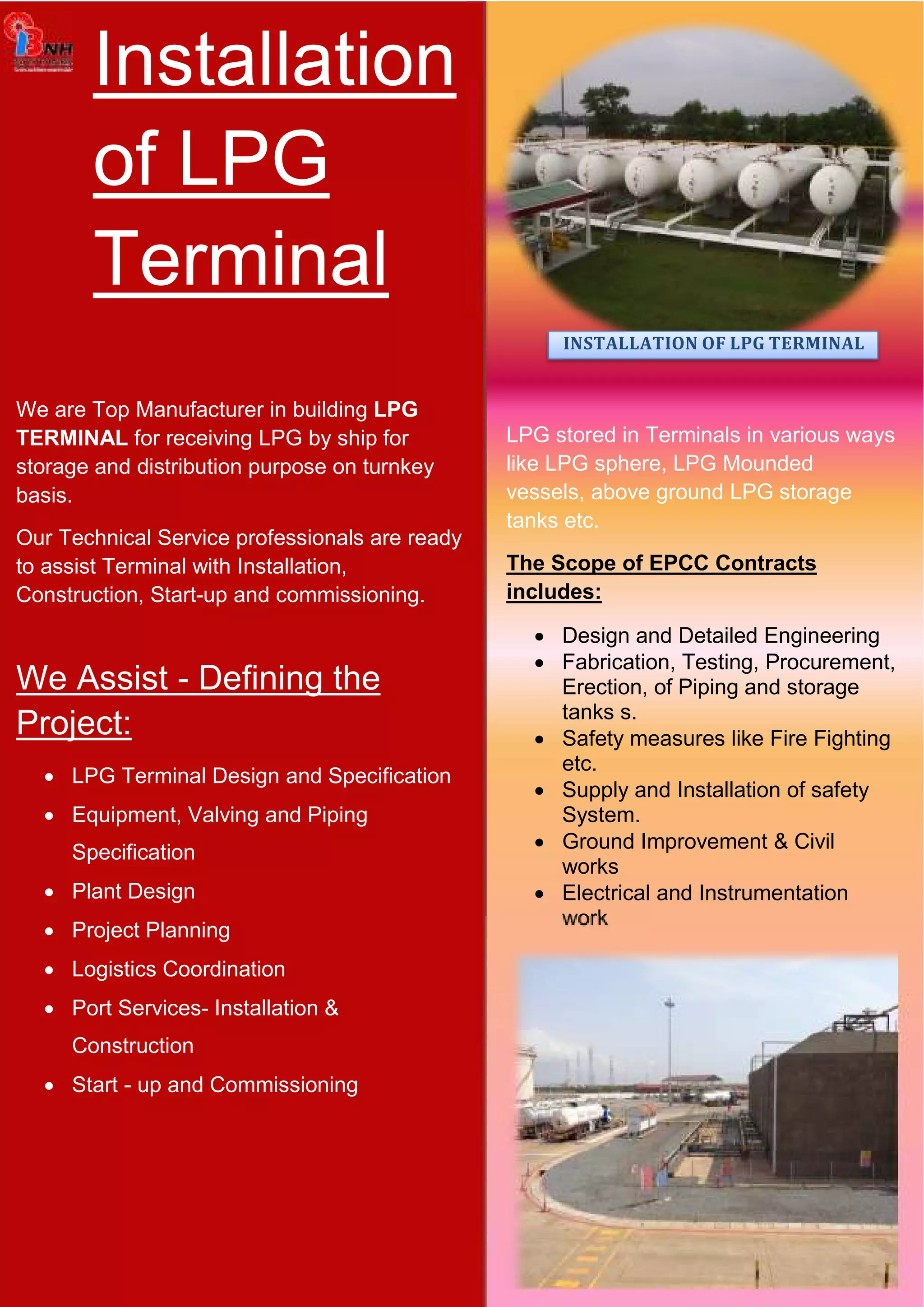 This document discusses the installation of LPG terminals by a top manufacturer. The company assists with terminal design, equipment specification, construction, start-up and commissioning. LPG is stored in terminals using spheres, mounded vessels or above ground tanks. The company provides turnkey EPCC contracts that cover design, engineering, fabrication, installation of piping and tanks, safety systems, civil works, and electrical and instrumentation work. They have experience building various types of LPG terminals globally.