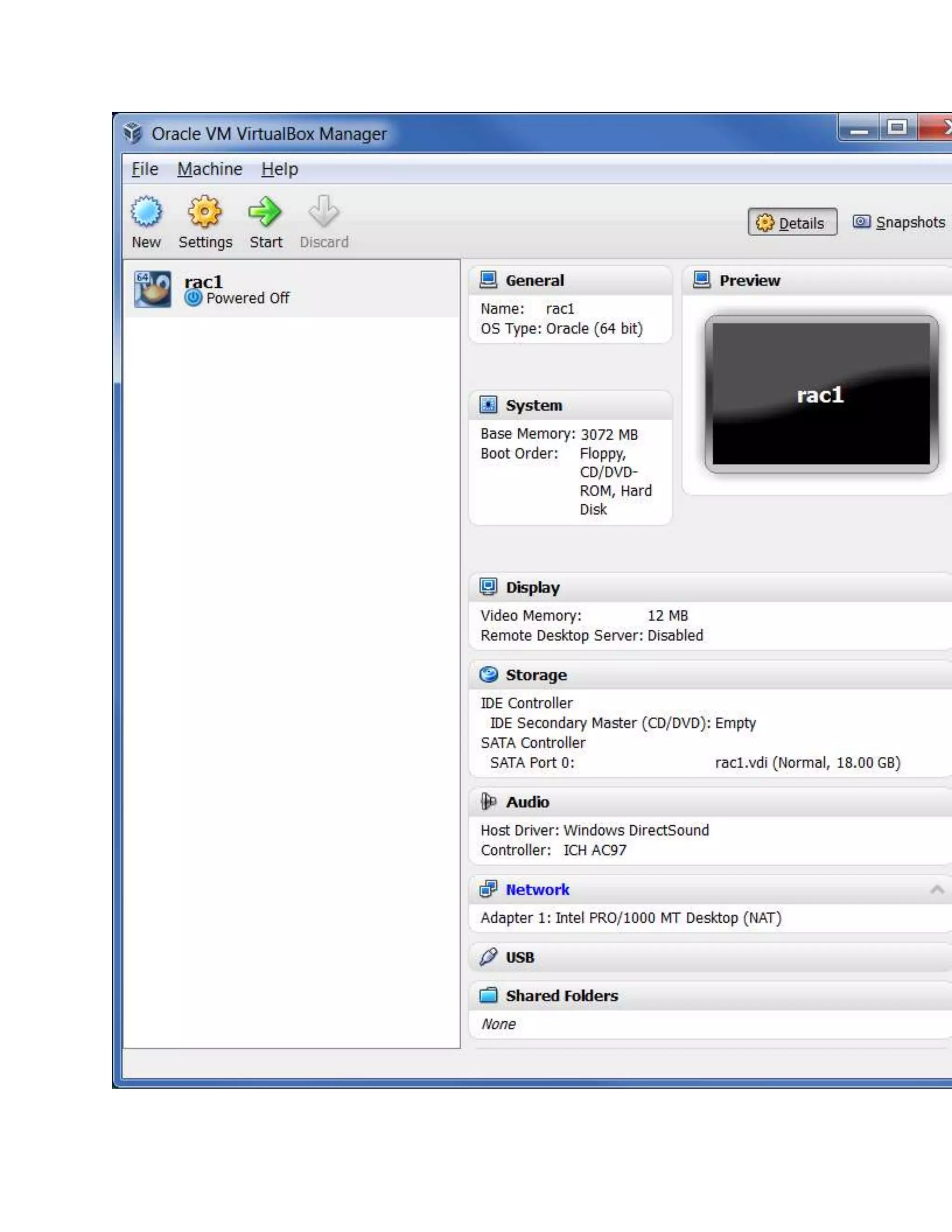 The document describes installing Oracle Database 12c Release 1 (12.1.0.1 64-bit) RAC on two Linux virtual machines using VirtualBox. It outlines setting up the virtual machines, installing Oracle Linux 6.4 as the guest operating system, and performing initial Oracle Clusterware installation prerequisites including installing prerequisite packages and configuring ASMLib.