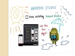 This document provides an introduction to an Android development training course. It will teach how to build a first Android app, including how to create an Android project, add a user interface, and handle user input. The instructor is an Android facilitator at Google who is certified in Android app development and holds a master's degree in computer science. It also provides an overview of the Android development process using Java and XML files in an integrated development environment like Android Studio.