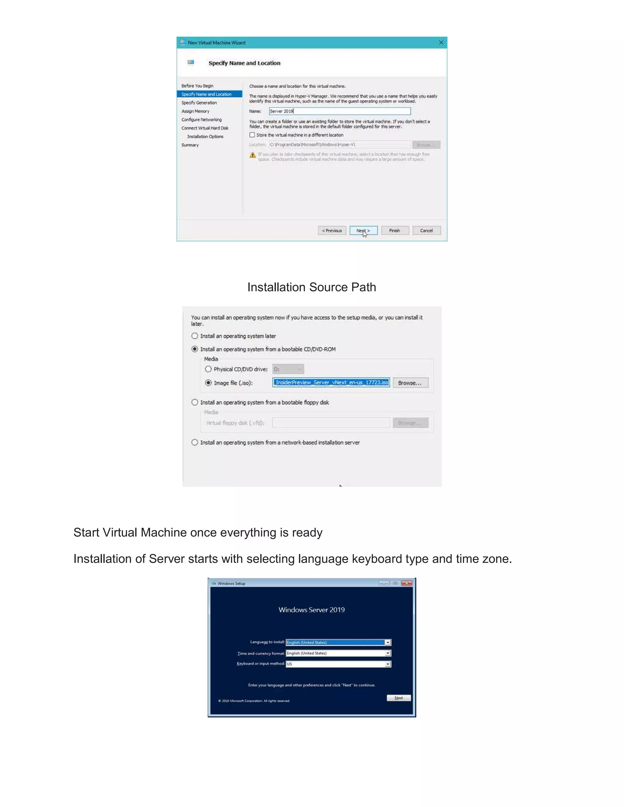 The document outlines the installation process for Windows Server 2019 Standard using Hyper-V, based on the insider preview build. It details the necessary system requirements, downloading the server ISO, configuring Hyper-V, and the installation steps including language selection and types of installations. The document concludes with the completion of installation and server readiness for testing.
