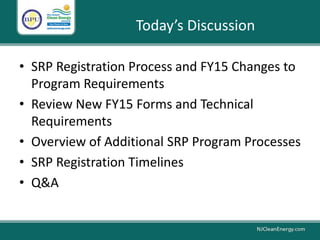 The document discusses changes to New Jersey's Solar Renewable Energy Certificate (SREC) Registration Program (SRP) for fiscal year 2015. Key points include: