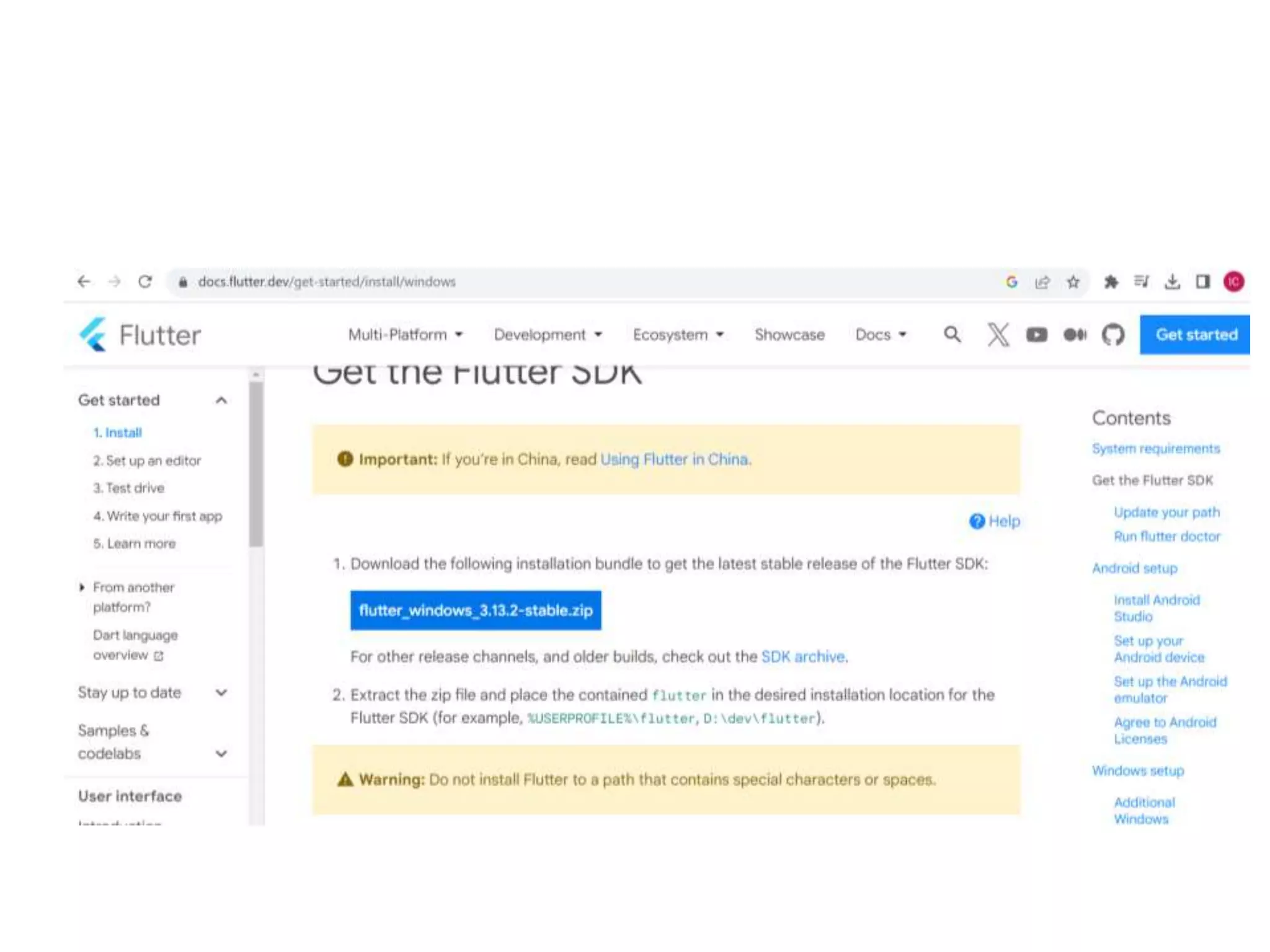 This document provides instructions for installing Flutter in Visual Studio Code on Windows. It outlines downloading and extracting the Flutter SDK, setting the environment path variable to the Flutter bin folder location, and installing Flutter extensions in VS Code. This allows a developer to create, run, and test mobile applications using Flutter and VS Code.