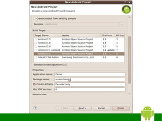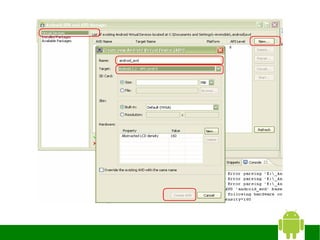 The document provides instructions for installing Eclipse, the Android SDK, and configuring them for Android development. It discusses: