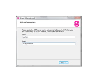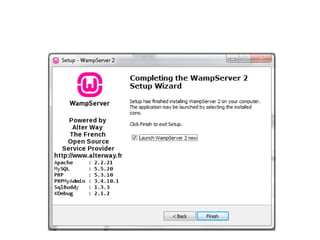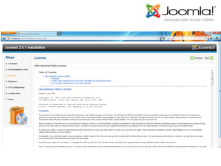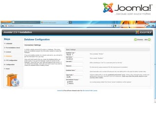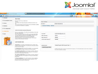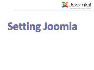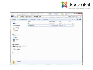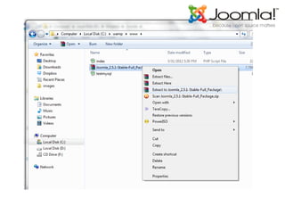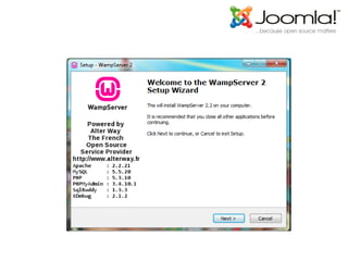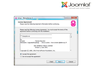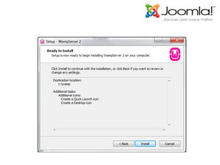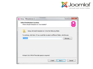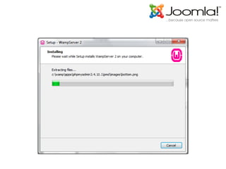 The document provides instructions for installing Joomla, an open source content management system, on a Windows system using WAMP. It outlines downloading and extracting Joomla files into the WAMP www directory, deleting the zip file, and accessing the installation page by visiting localhost/joomla to begin the installation process which includes creating a database.