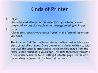 This document discusses different types of printers and how to install local and network printers. It covers inkjet, laser, thermal, and impact printers. For local USB or wireless printers, Windows will usually detect them automatically, but older models may require manual installation. For network printers, you can either share a printer connected to one computer or connect the printer directly to the network as a standalone device. The installation process involves adding the printer in Devices and Printers and selecting whether it's a local, shared, or network printer.