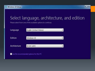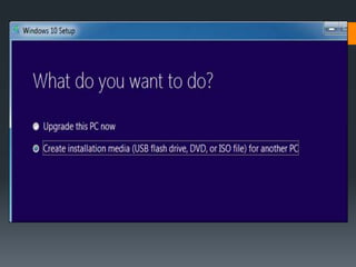 The document provides a comprehensive guide on installing Windows 10, detailing both upgrade and clean installation processes. It covers using Microsoft's upgrade tool, creating installation media, and the steps needed to successfully install the operating system while ensuring the user is aware of important considerations such as backup and partition management. Additionally, it includes instructions for activation and installation in a virtual machine.
