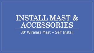 This document provides instructions for installing a 30-foot wireless mast and Ubiquiti networking equipment for broadband internet access. It involves digging a hole and setting ground anchors in a triangular pattern around the hole. The mast is assembled and connected to guy wires attached to the ground anchors. Cables are run up the mast to connect a Ubiquiti radio to a power over ethernet adapter and a computer. When complete, the setup provides long-range wireless internet access through the Ubiquiti equipment mounted at the top of the mast.