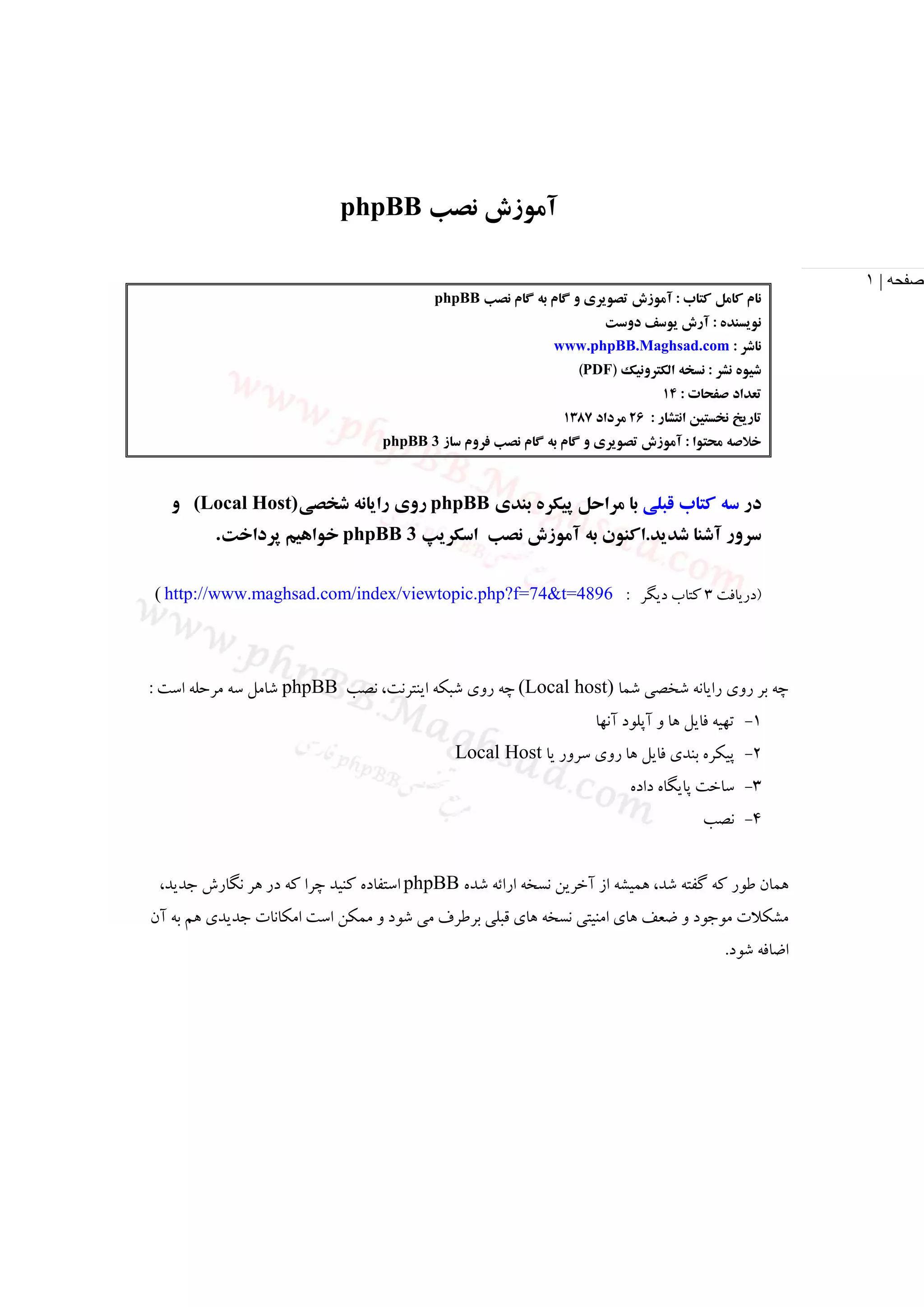 صفحه | ١ ﻧﺎم ﻛﺎﻣﻞ ﻛﺘﺎب : آﻣﻮزش ﺗﺼﻮﻳﺮي و ﮔﺎم ﺑﻪ ﮔﺎم ﻧﺼﺐ phpBB ﻧﻮﻳﺴﻨﺪه : آرش ﻳﻮﺳﻒ دوﺳﺖ ﻧﺎﺷﺮ : www.phpBB.Maghsad.com ﺷﻴﻮه ﻧﺸﺮ : ﻧﺴﺨﻪ اﻟﻜﺘﺮوﻧﻴﻚ )(PDF ﺗﻌﺪاد ﺻﻔﺤﺎت : 41 ﺗﺎرﻳﺦ ﻧﺨﺴﺘﻴﻦ اﻧﺘﺸﺎر : 62 ﻣﺮداد 7831 ﺧﻼﺻﻪ ﻣﺤﺘﻮا : آﻣﻮزش ﺗﺼﻮﻳﺮي و ﮔﺎم ﺑﻪ ﮔﺎم ﻧﺼﺐ ﻓﺮوم ﺳﺎز 3 phpBB در ﺳﻪ ﻛﺘﺎب ﻗﺒﻠﻲ ﺑﺎ ﻣﺮاﺣﻞ ﭘﻴﻜﺮه ﺑﻨﺪي phpBBروي راﻳﺎﻧﻪ ﺷﺨﺼﻲ) (Local Hostو ﺳﺮور آﺷﻨﺎ ﺷﺪﻳﺪ.اﻛﻨﻮن ﺑﻪ آﻣﻮزش ﻧﺼﺐ اﺳﻜﺮﻳﭗ 3 phpBBﺧﻮاﻫﻴﻢ ﭘﺮداﺧﺖ. )درﻳﺎﻓﺖ 3 ﻛﺘﺎب دﻳﮕﺮ : 6984=( http://www.maghsad.com/index/viewtopic.php?f=74&t ﭼﻪ ﺑﺮ روي راﻳﺎﻧﻪ ﺷﺨﺼﻲ ﺷﻤﺎ ) (Local hostﭼﻪ روي ﺷﺒﻜﻪ اﻳﻨﺘﺮﻧﺖ، ﻧﺼﺐ phpBBﺷﺎﻣﻞ ﺳﻪ ﻣﺮﺣﻠﻪ اﺳﺖ : 1- ﺗﻬﻴﻪ ﻓﺎﻳﻞ ﻫﺎ و آﭘﻠﻮد آﻧﻬﺎ 2- ﭘﻴﻜﺮه ﺑﻨﺪي ﻓﺎﻳﻞ ﻫﺎ روي ﺳﺮور ﻳﺎ Local Host 3- ﺳﺎﺧﺖ ﭘﺎﻳﮕﺎه داده 4- ﻧﺼﺐ ﻫﻤﺎن ﻃﻮر ﻛﻪ ﮔﻔﺘﻪ ﺷﺪ، ﻫﻤﻴﺸﻪ از آﺧﺮﻳﻦ ﻧﺴﺨﻪ اراﺋﻪ ﺷﺪه phpBBاﺳﺘﻔﺎده ﻛﻨﻴﺪ ﭼﺮا ﻛﻪ در ﻫﺮ ﻧﮕﺎرش ﺟﺪﻳﺪ، ﻣﺸﻜﻼت ﻣﻮﺟﻮد و ﺿﻌﻒ ﻫﺎي اﻣﻨﻴﺘﻲ ﻧﺴﺨﻪ ﻫﺎي ﻗﺒﻠﻲ ﺑﺮﻃﺮف ﻣﻲ ﺷﻮد و ﻣﻤﻜﻦ اﺳﺖ اﻣﻜﺎﻧﺎت ﺟﺪﻳﺪي ﻫﻢ ﺑﻪ آن اﺿﺎﻓﻪ ﺷﻮد.